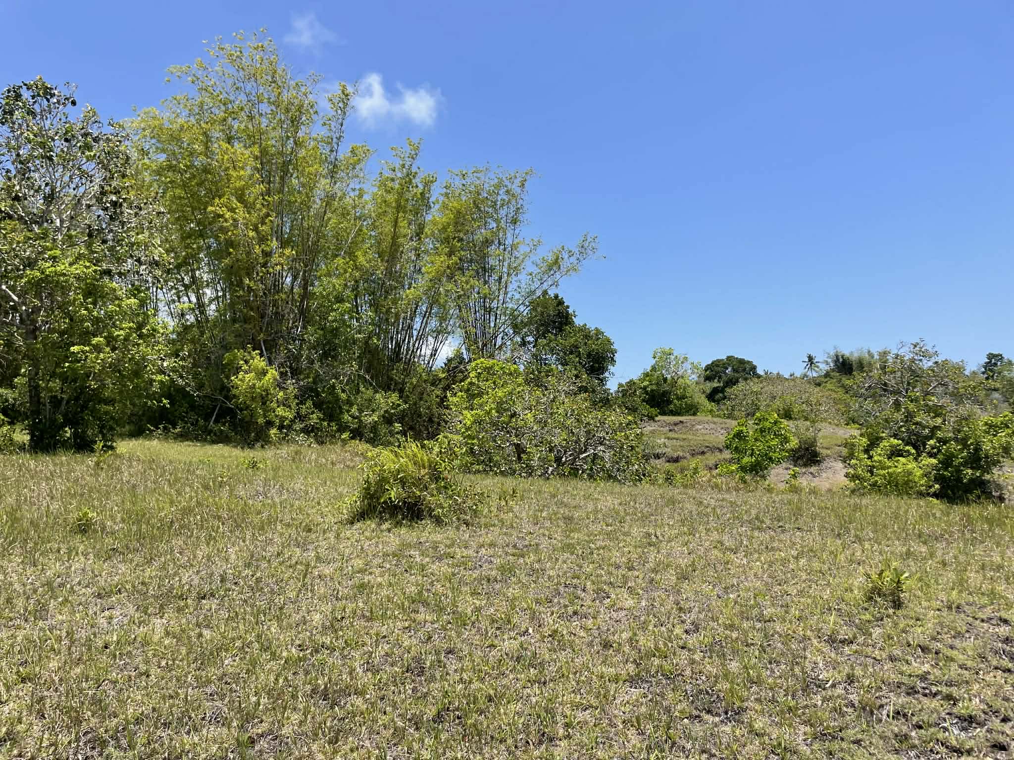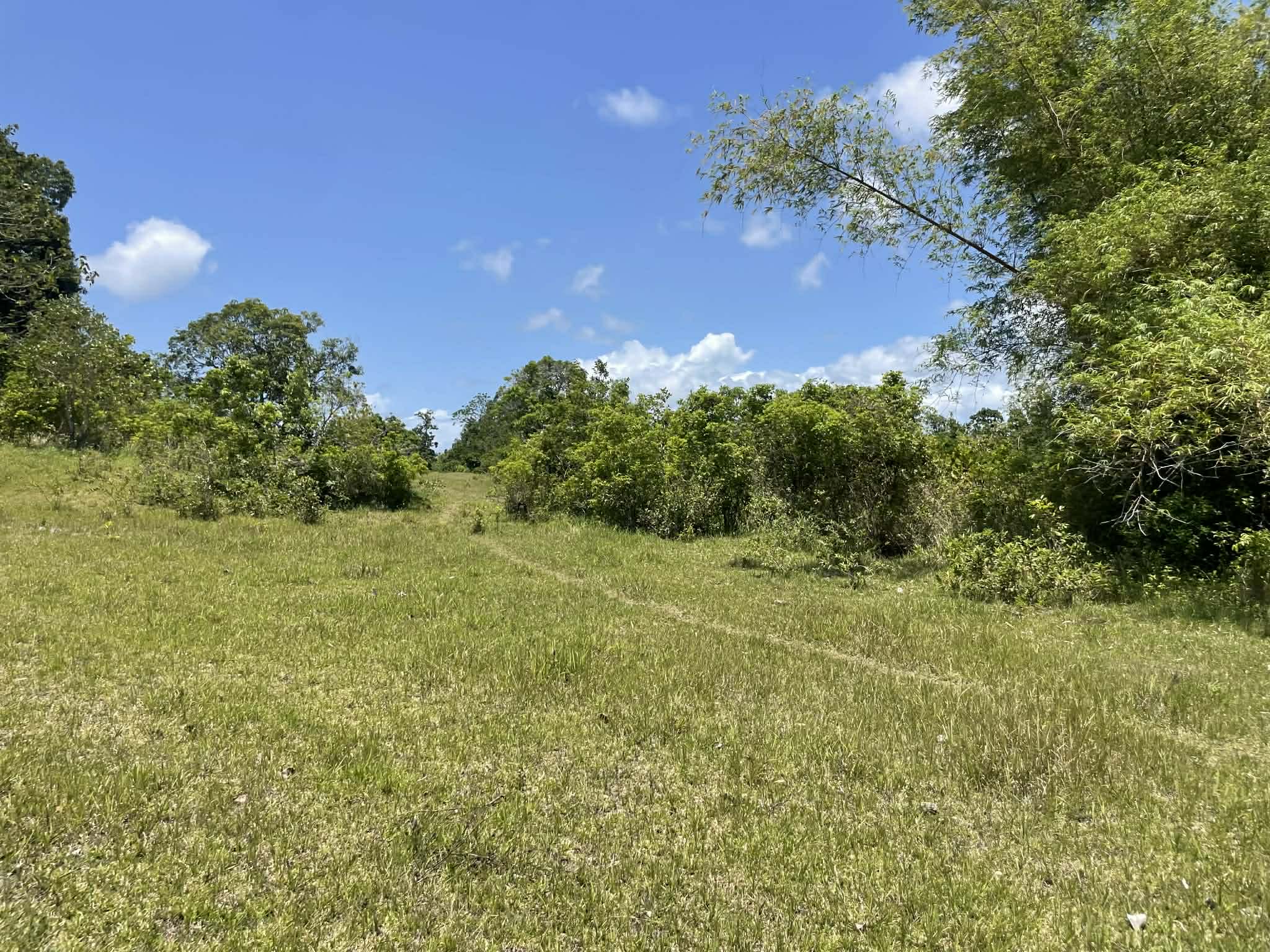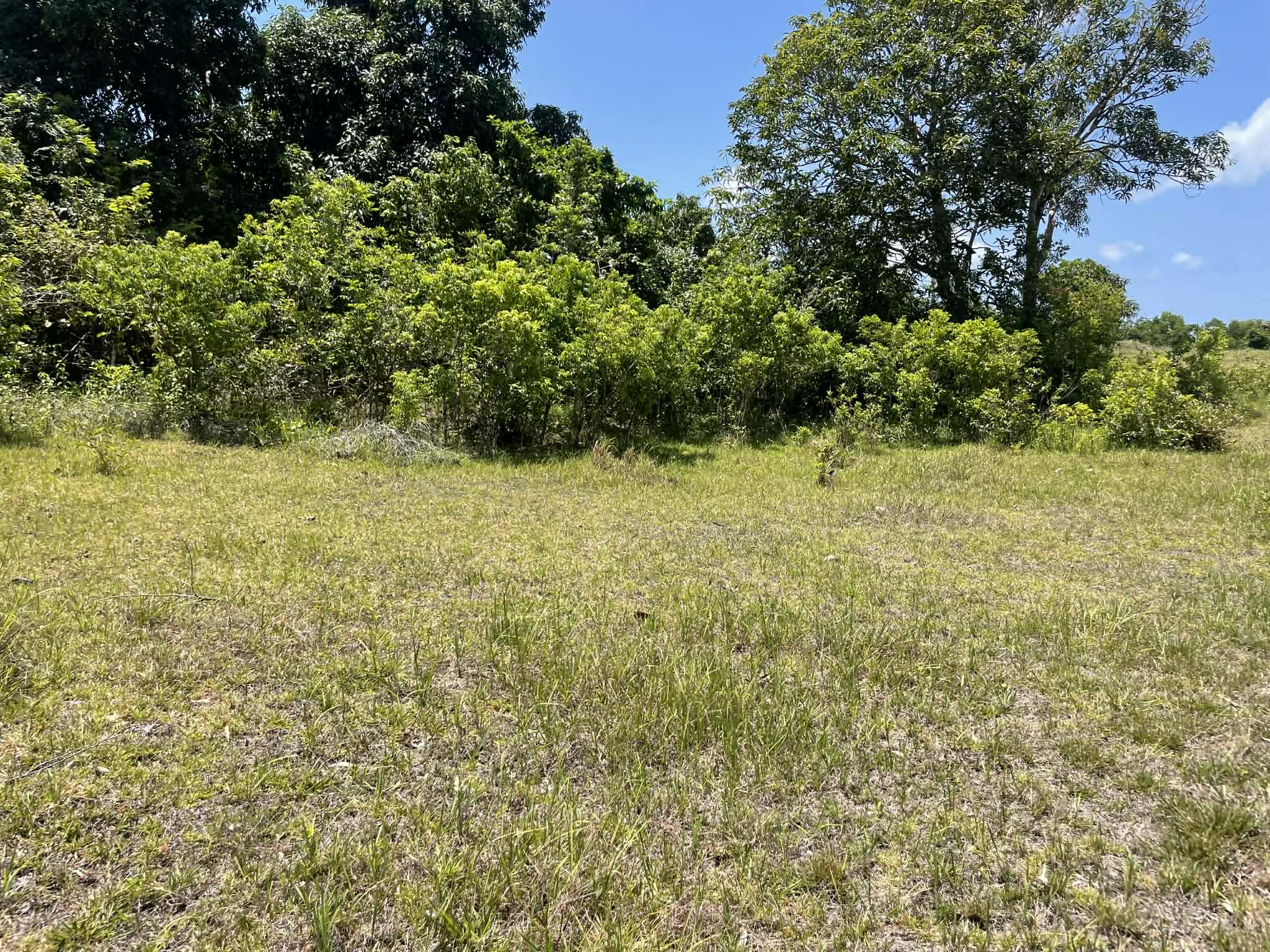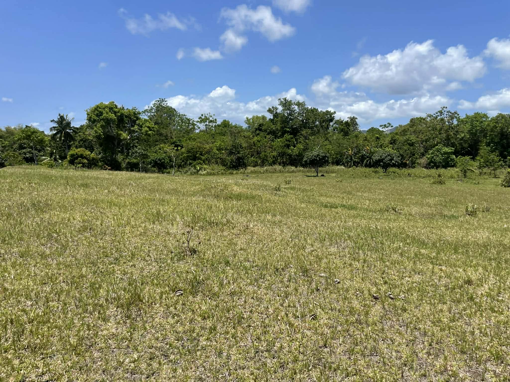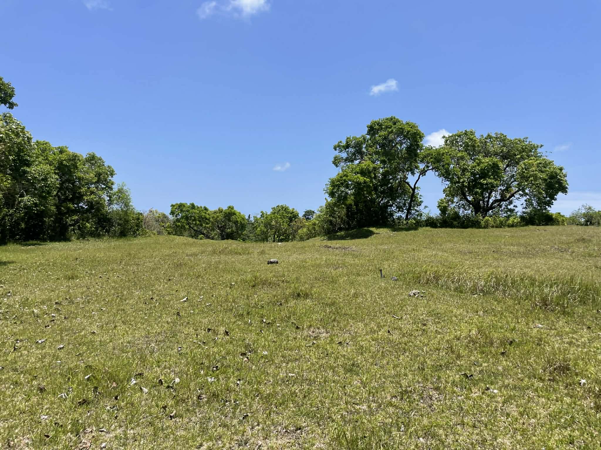 This expansive property offers a wide, open landscape with predominantly flat terrain, complemented by a gentle slope that remains highly usable and ideal for development. The land features broad grassy areas surrounded by lush greenery, creating a peaceful and natural setting.