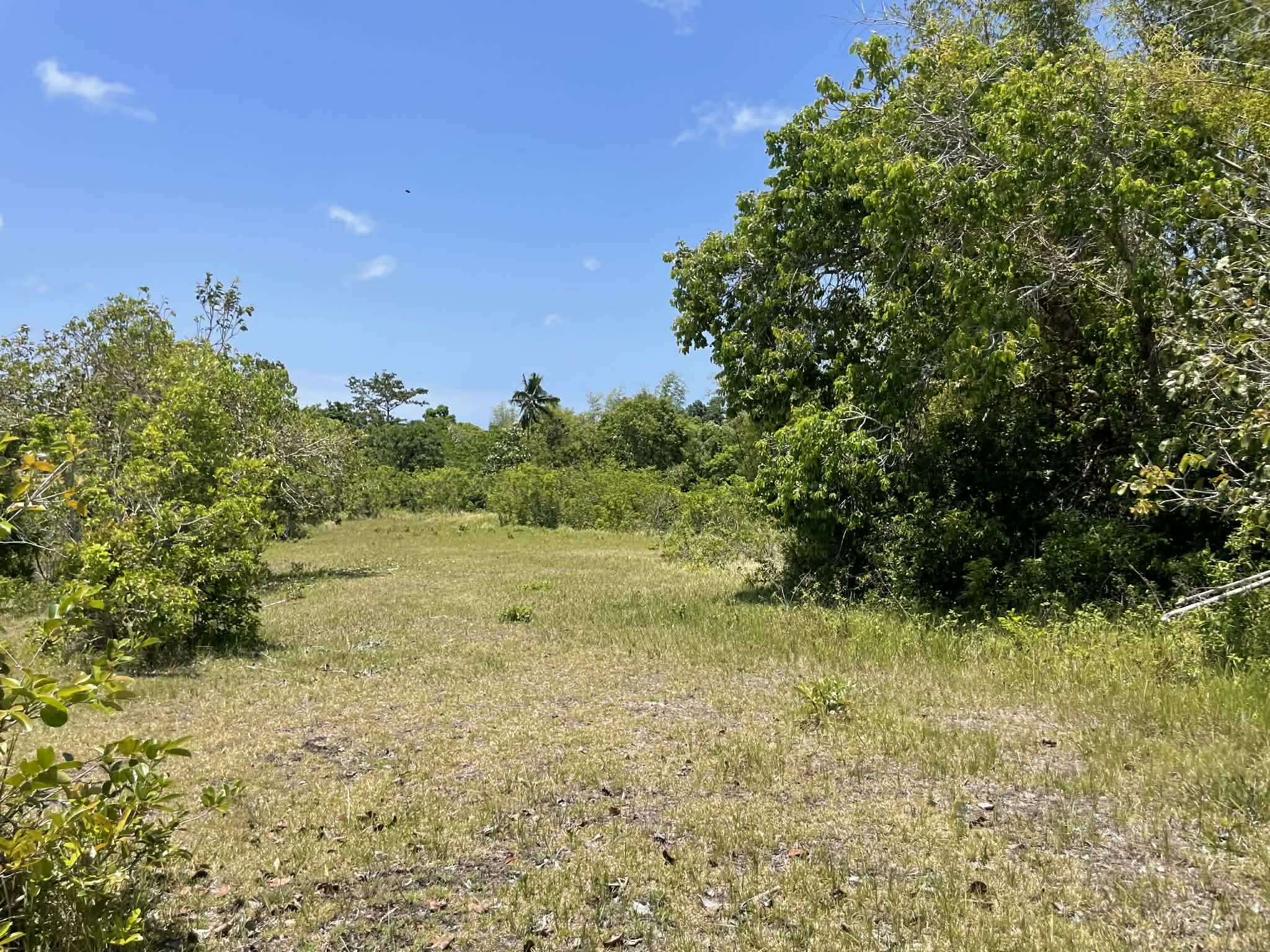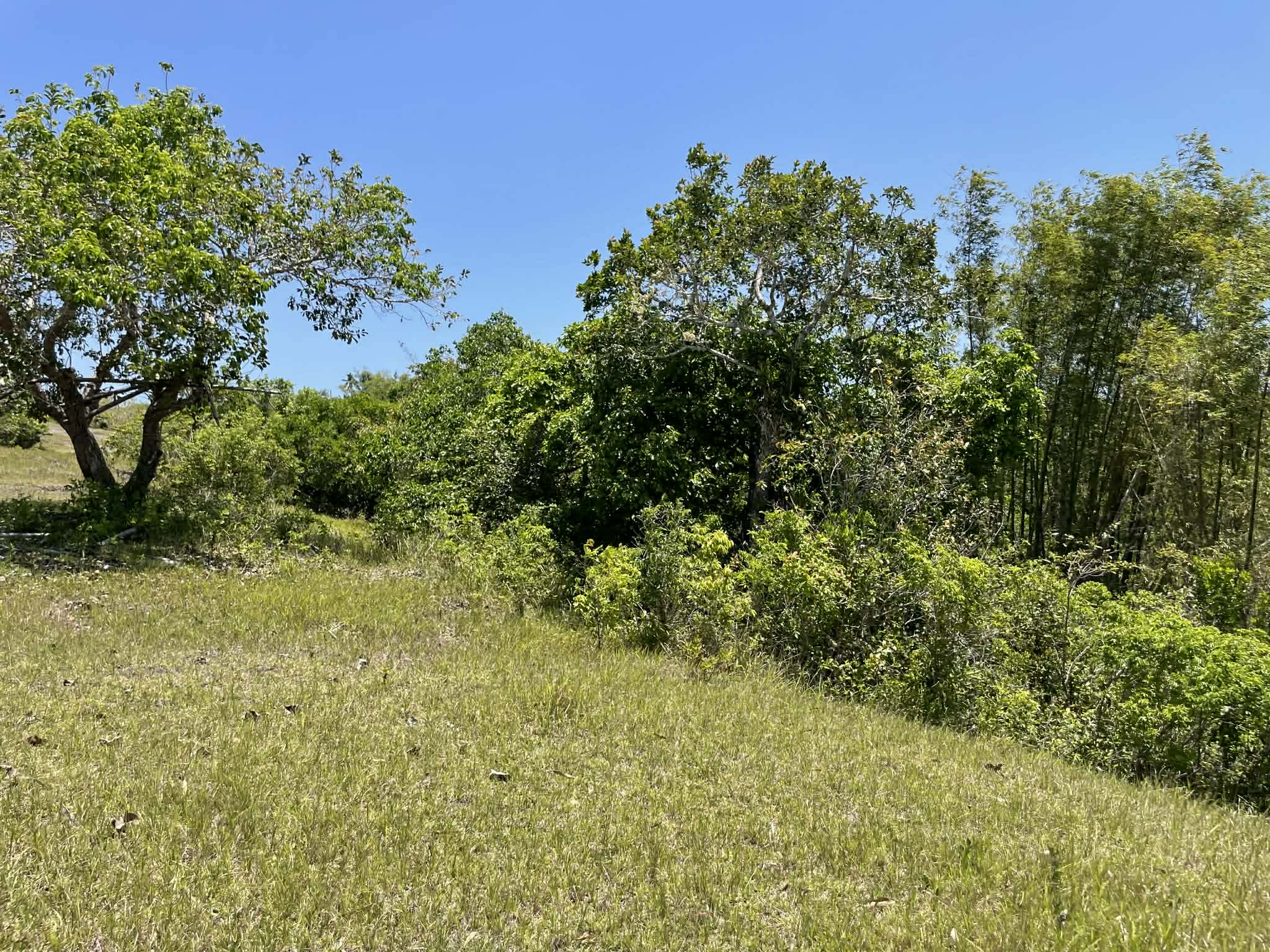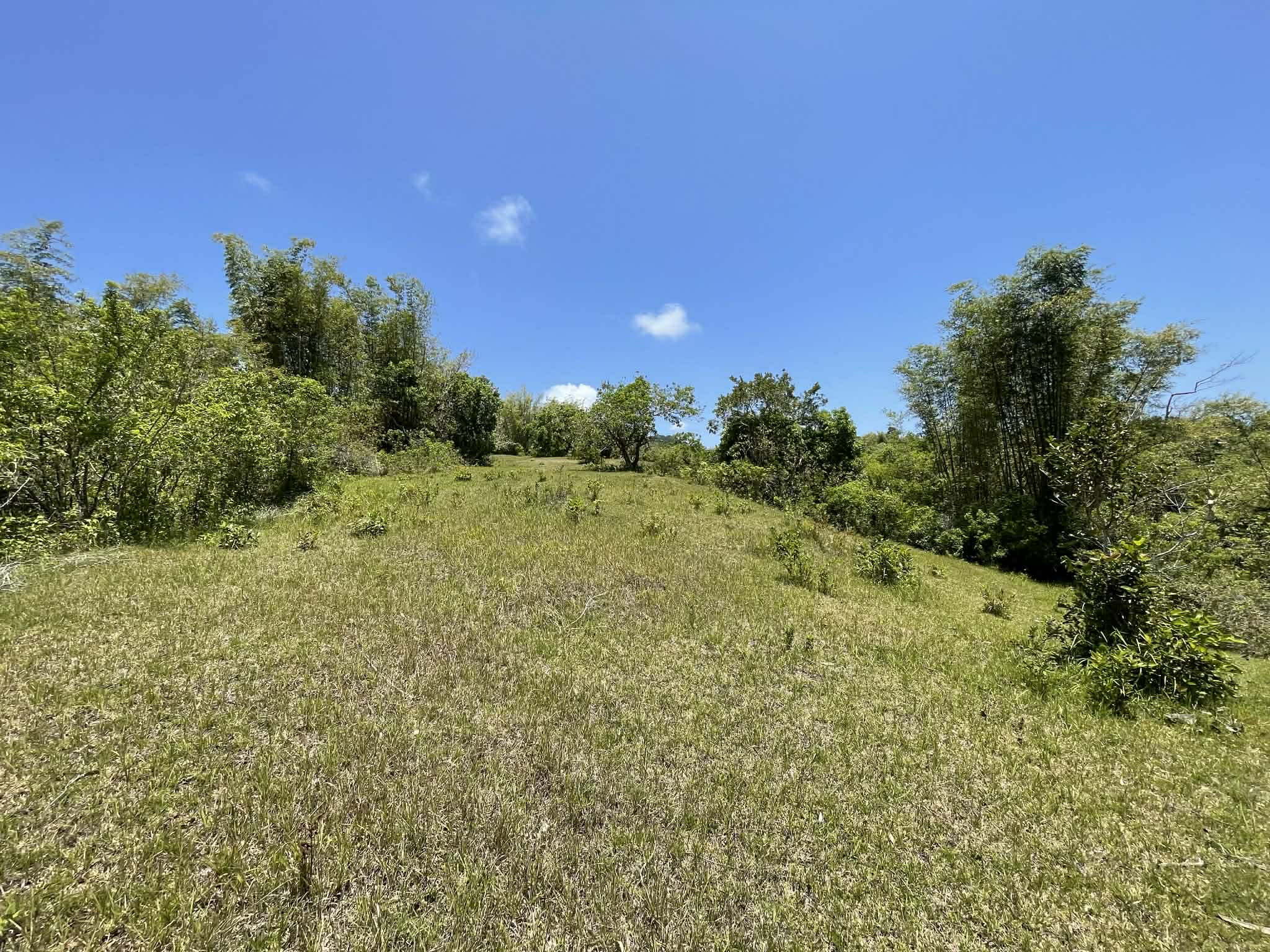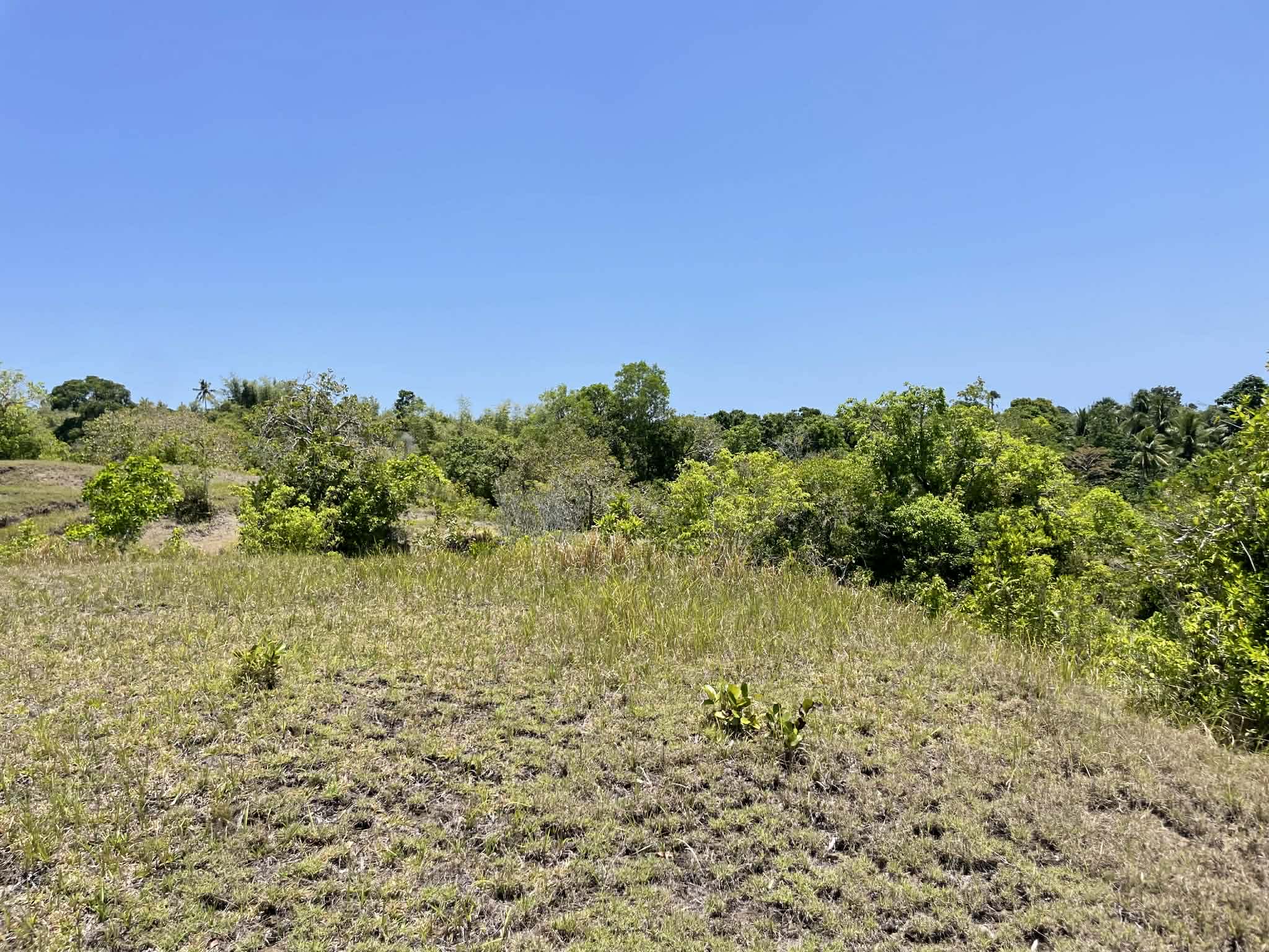 This expansive property offers a wide, open landscape with predominantly flat terrain, complemented by a gentle slope that remains highly usable and ideal for development. The land features broad grassy areas surrounded by lush greenery, creating a peaceful and natural setting.